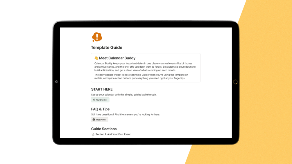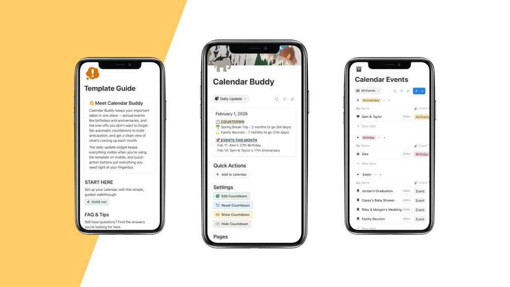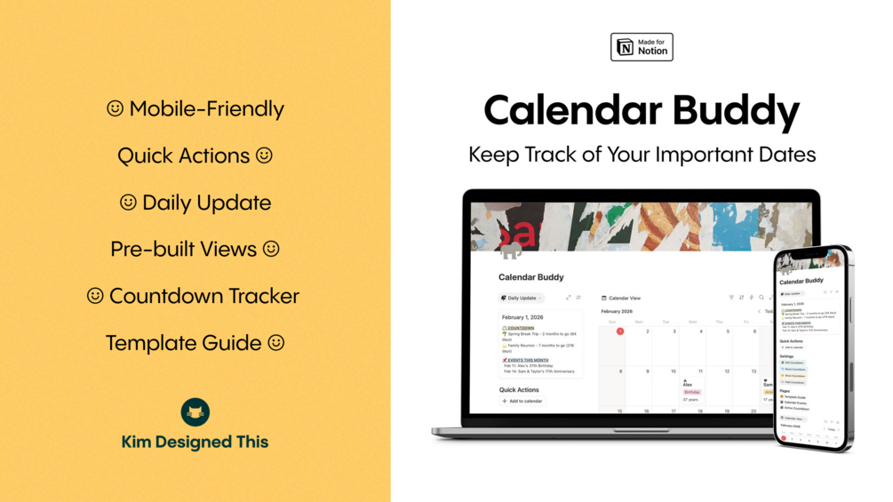 Calendar Buddy is a Notion template that keeps your real-life dates in one place. Track appointments, birthdays, deadlines, renewals, trips, and anything else you want to keep on your radar.