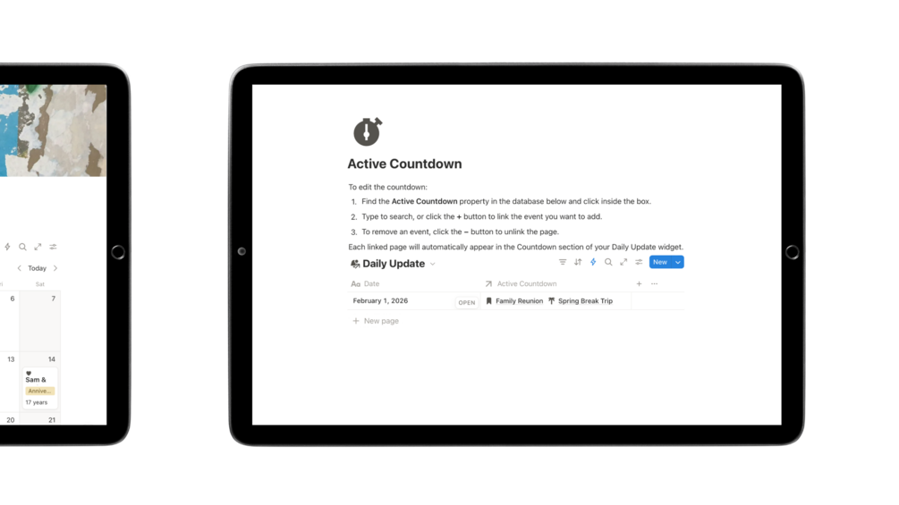 A Notion template for keeping your important dates in one place, with quick add buttons, a clean calendar view, and an optional countdown for your next big date.